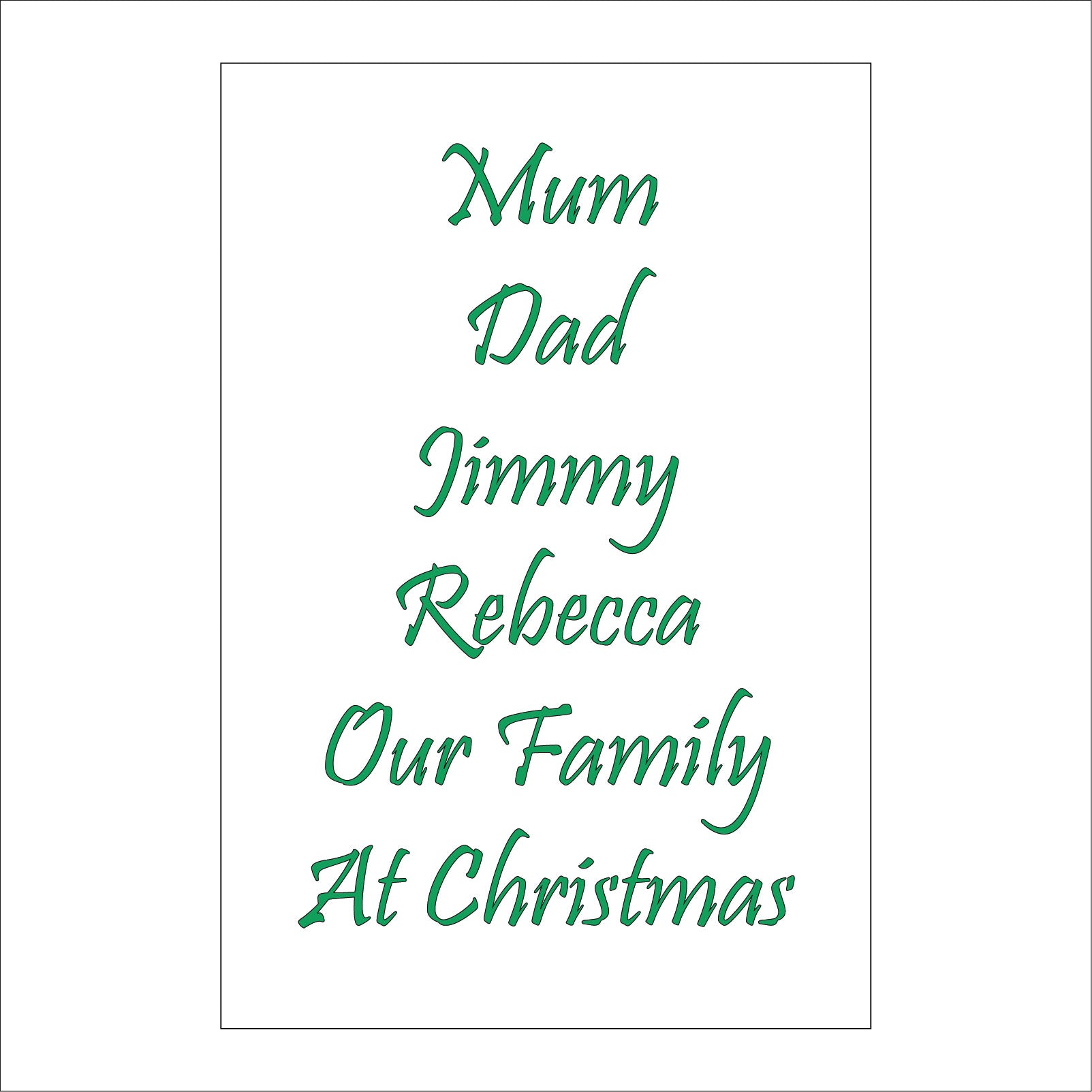 The format of the standard XM265 sign is Billboard Portrait and displays a Green -/Our Family At Christmas Personalise Choice Names Text Unique text on a White Background.
